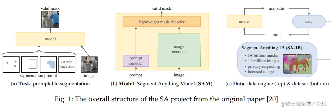 SAM 源自于 2023 年 Meta 的 Segment Anything (SA) 项目。该项目发现在 NLP 和 CV 领域中出现的基础模型表现出较强的性能,研究人员试图建立一个类似的模型来统一整个图像分割任务。然而,在分割领域的可用数据较为缺乏,这与他们的设计目的不同。因此,如图 1 所示,研究者将路径分为任务、模型和数据三个步骤。