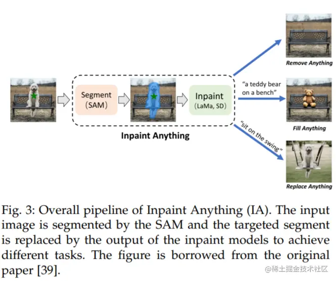 Inpaint Anything (IA) [39] 设计了一个流程,通过结合 SAM 的优势、最先进的图像修复器 [99],以及 AI 生成的内容模型 [103],来解决与修复相关的问题。这个流程如图 3 所示。对于对象移除,该流程由 SAM 和最先进的修复器组成,如 LaMa [99]。用户的点击操作被用作 SAM 的提示,以生成对象区域的掩码,然后 LaMa 使用 corrosion 和 dilation 操作进行填充。对于对象的填充和替换,第二步使用像 Stable Diffusion (SD) [103] 这样的 AI 生成的内容模型,通过文本提示用新生成的对象填充选定的对象。