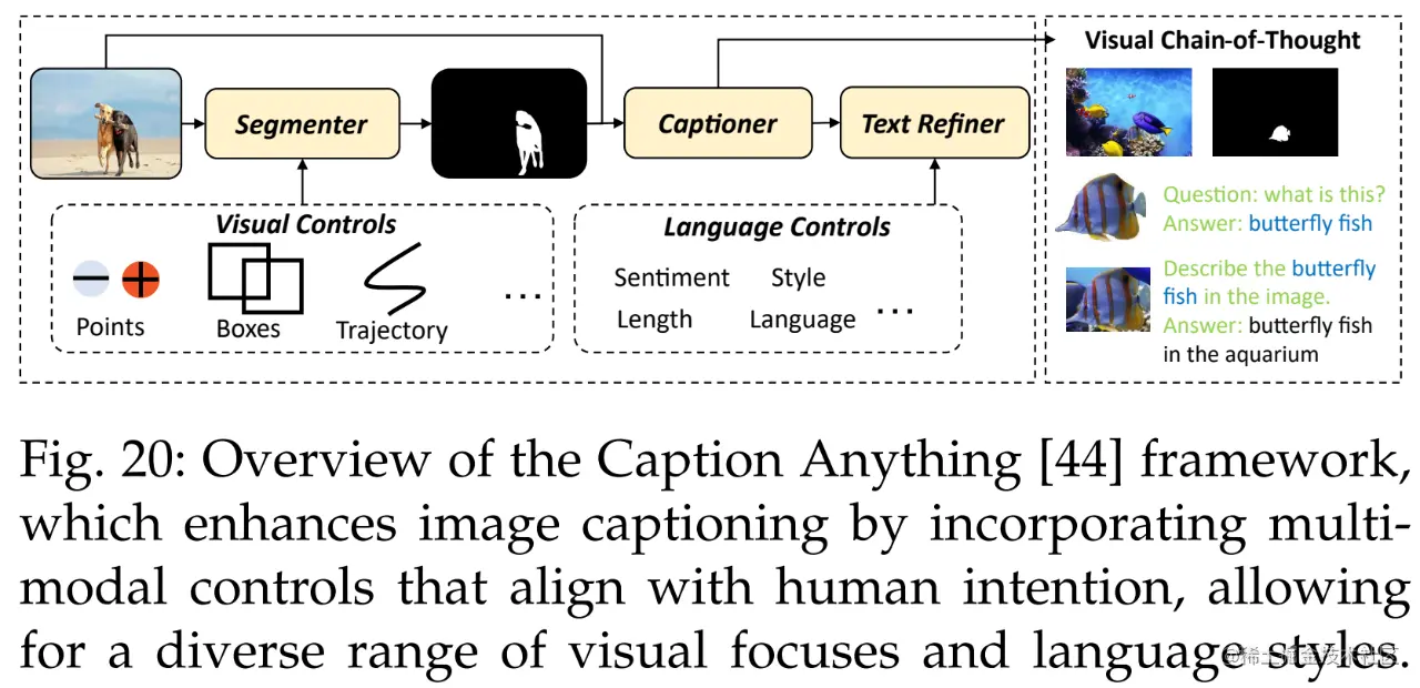 此外还有图像字幕。Wang et al. [44] 提出了一种用于可控图像字幕的方法 Caption Anything(CAT),如下图 20 所示,CAT 的框架将多模态控制引入图像字幕,呈现符合人类意图的各种视觉焦点和语言风格。