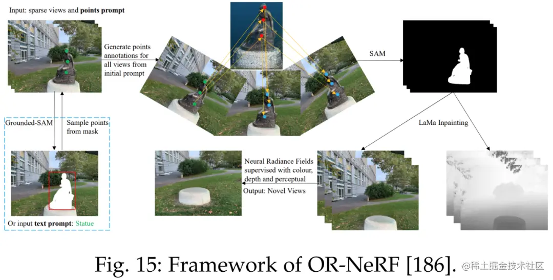 参考文献 [186] 提出了一种新的对象移除 pipeline ORNeRF,它使用单个视图上的点或文本 prompt 从 3D 场景中移除对象。通过使用点投影策略将用户注释快速传播给所有视图,该方法使用比以往工作更少的时间实现了更好的性能。下图 15 为 ORNeRF 的框架。