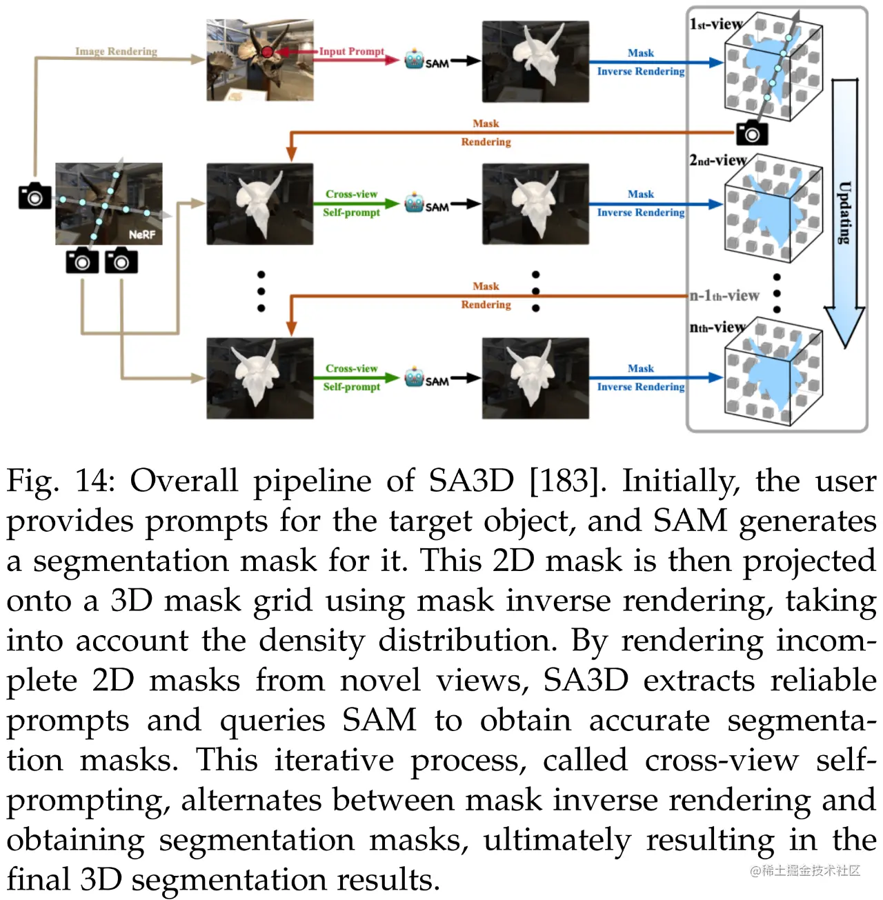 首先是 3D 重建。除了实现细粒度的 3D 分割,SA3D [183] 可以用于 3D 重建。利用 3D 掩码网格,研究者可以确定物体在 3D 中的占用空间,并以各种方式重建。下图 14 为 SA3D 的整体 pipeline。
