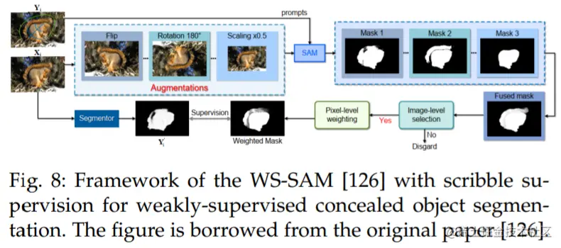 He 等人 [126] 提出了第一种方法(WSSAM),利用 SAM 进行弱监督隐蔽物体分割,解决了使用稀疏注释数据分割与周围环境融为一体的物体的挑战(参见图 8)。所提出的 WSSAM 包括基于 SAM 的伪标记和多尺度特征分组,以提高模型学习和区分隐蔽物体和背景。作者发现,仅使用 scribble 监督 [127],SAM 就可以生成足够好的分割掩码,以训练分割器。