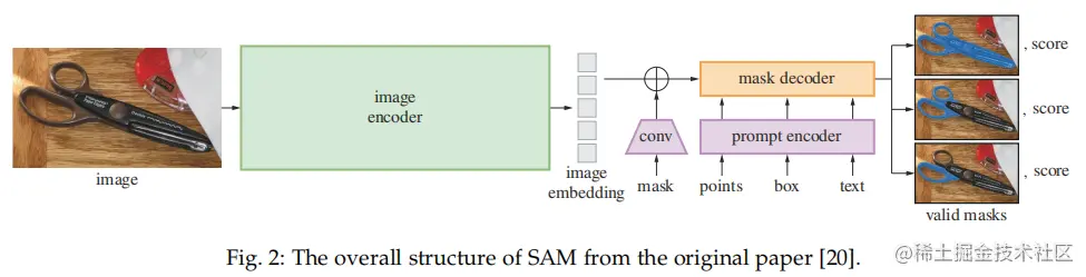 SAM 架构如下所示,主要包含三个部分:图像编码器;提示编码器;以及掩码解码器。