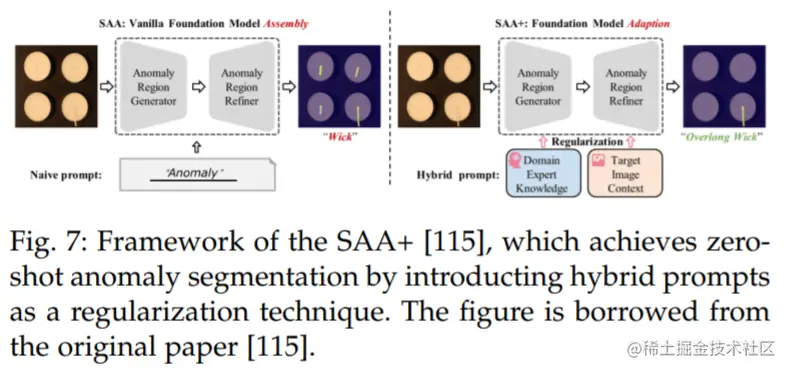 Cao 等人 [115] 提出了一个新的框架,名为 Segment Any Anomaly + (SAA+),用于零样本异常分割,如图 7 所示。该框架利用混合提示规范化来提高现代基础模型的适应性,从而无需领域特定的微调就能进行更精确的异常分割。作者在四个异常分割基准上进行了详细的实验,即 VisA [122],MVTecAD [123],MTD [124] 和 KSDD2 [125],并取得了最先进的性能。