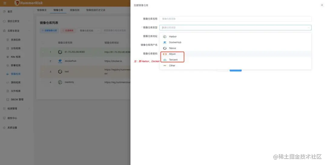 镜像仓库新增公有云阿里云、腾讯云类型,同步镜像并加入到镜像管理里,方便进行检测。
