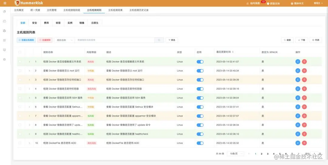 新增 Linux 主机 docker 内置检测规则组和规则,通过检测获取资源合规结果。(X-PACK)