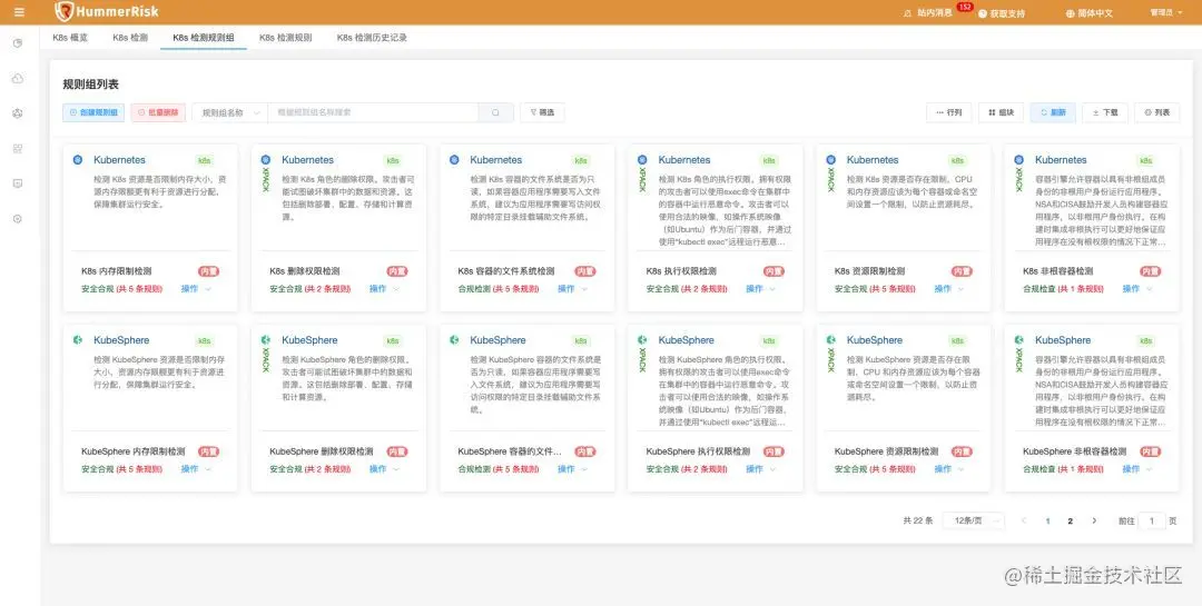 新增 Kubernetes 、Rancher 和 KubeSphere类型内置检测规则组和规则,通过检测获取资源合规结果。(X-PACK)