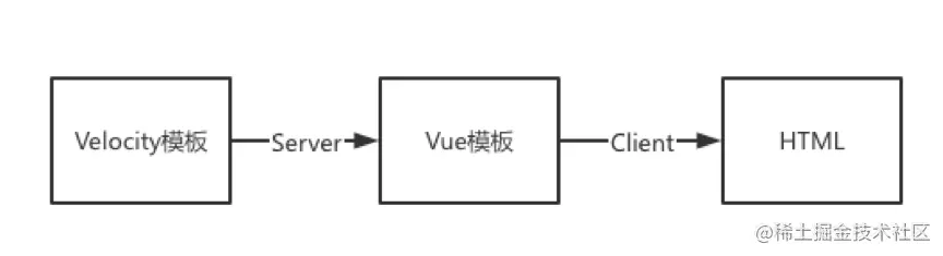 混合架构内部,模板渲染需要分两步进行: Velocity模板首先在服务端渲染为Vue模板,Vue模板在客户端渲染为最终页面。