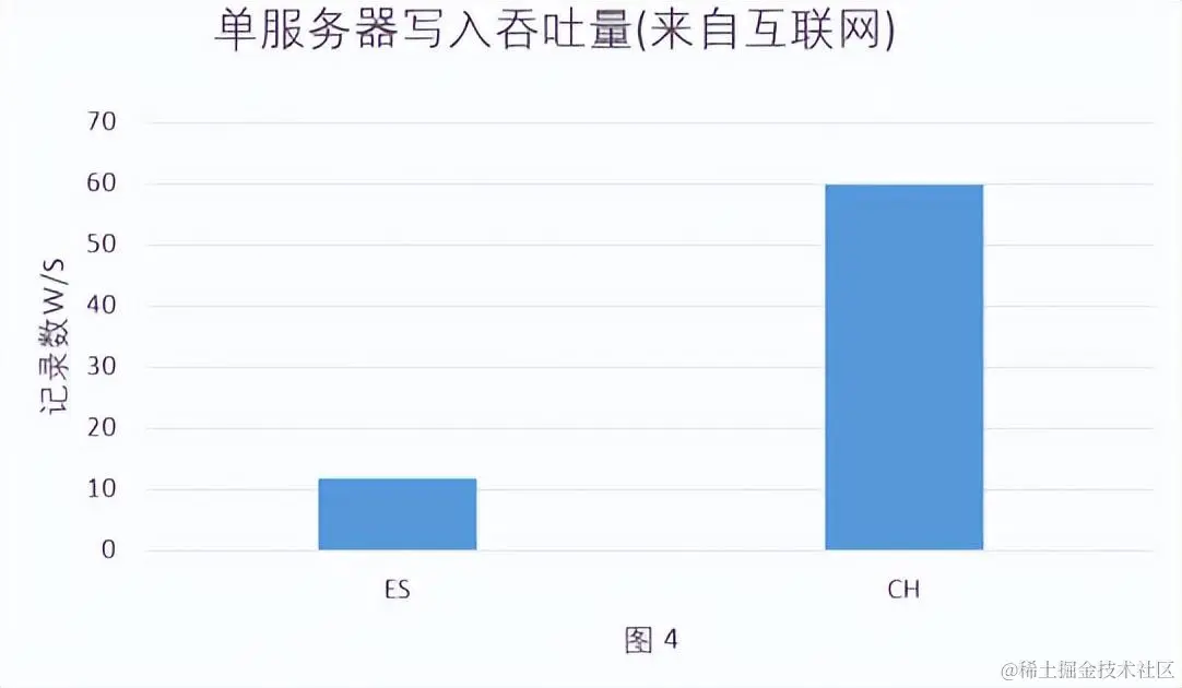 - 写入吞吐量:CH单机写入速度大约为50~200MB/s,如果写入的数据每行为1kb,写入速度为5-20W/s,图 4(写入吞吐量)为互联网上Elasticsearch与Clickhouse写入数据的对比图,同等数据样本的情况下CH写入性能是Elasticsearch的5倍。由于我们目前Flink任务为双写,考虑到会互相影响,后续补充压测结果。