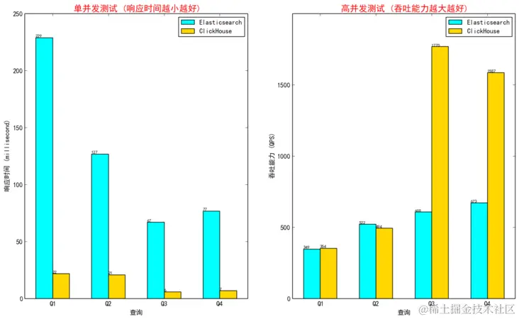 结论:Clickhouse对于高并发支持的不够,官方建议最大QPS为100。高并发情况下吞吐量不如Elasticsearch更友好