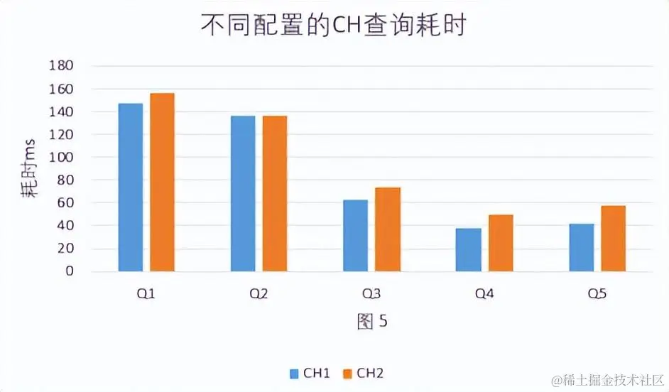 - Clickhouse自身在集群配置差一倍的情况下查询性能差异不是很大,CH2(48C 182GB)比CH1(80C 320GB)平均慢14%。见图 5