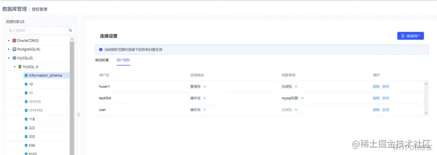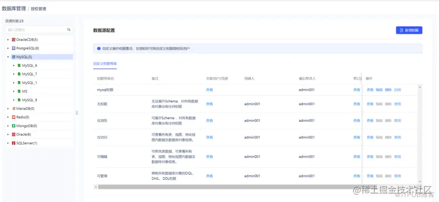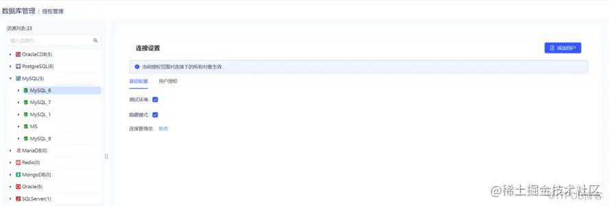 v 2.0.0 的授权管理模块可对有启用资源的连接进行授权操作,包括新增权限、查看关联用户、查看权限的修订历史等。