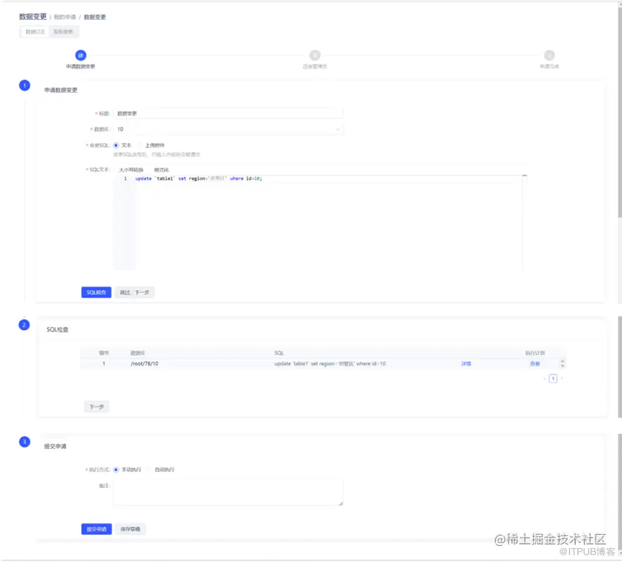 v2.0.0 新增了数据变更功能,发现少量错误数据时可以发起数据订正申请。数据订正支持** SQL 和上传附件**两种方式,用户可以对订正 SQL 进行 SQL 检查。