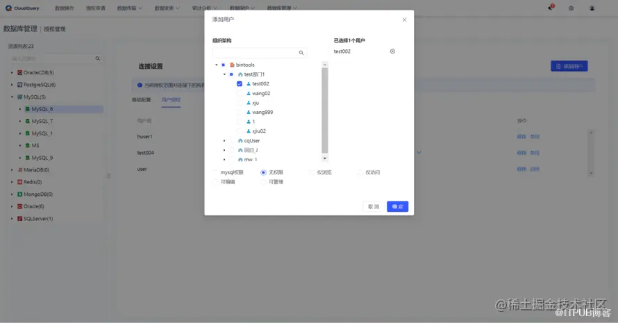 v2.0.0 的角色管理定义了两层角色,即 CloudQuery 系统角色、数据库管理角色,系统角色负责控制用户与系统菜单的关系,数据库管理角色则控制用户与业务之间的关系。