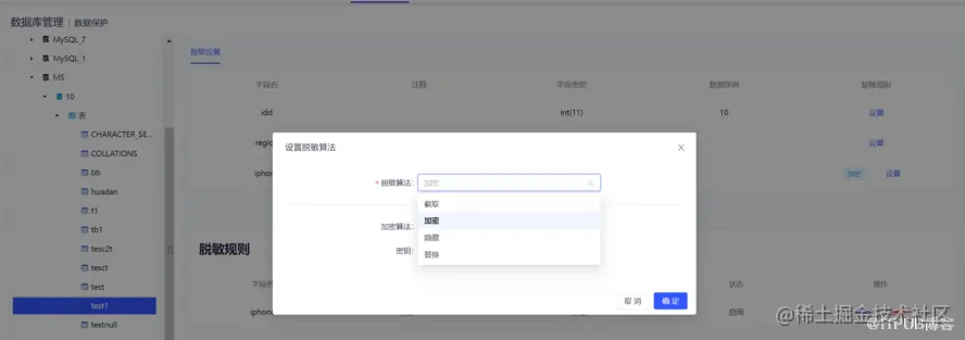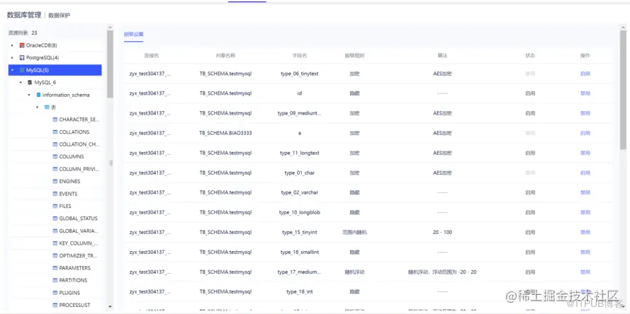 数据保护模块即动态脱敏,针对不同的资源设置脱敏规则。v2.0.0 支持直接对表中的某字段设置脱敏规则,脱敏算法包括范围内随机、隐藏、随机浮动、截取、加密、替换。