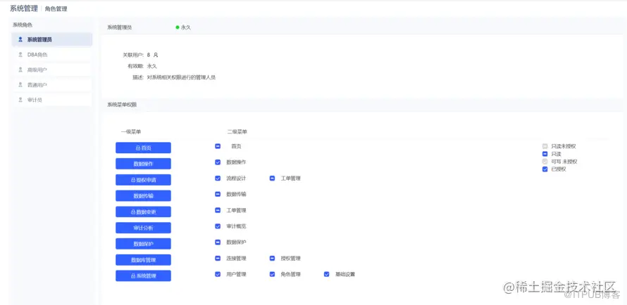 系统角色用于分配 CQ 系统菜单权限,包括系统管理员、DBA角色、高级用户、普通用户、审计员;数据库管理角色用于分配连接管理内页面功能权限,分超级管理员、管理员和普通用户。