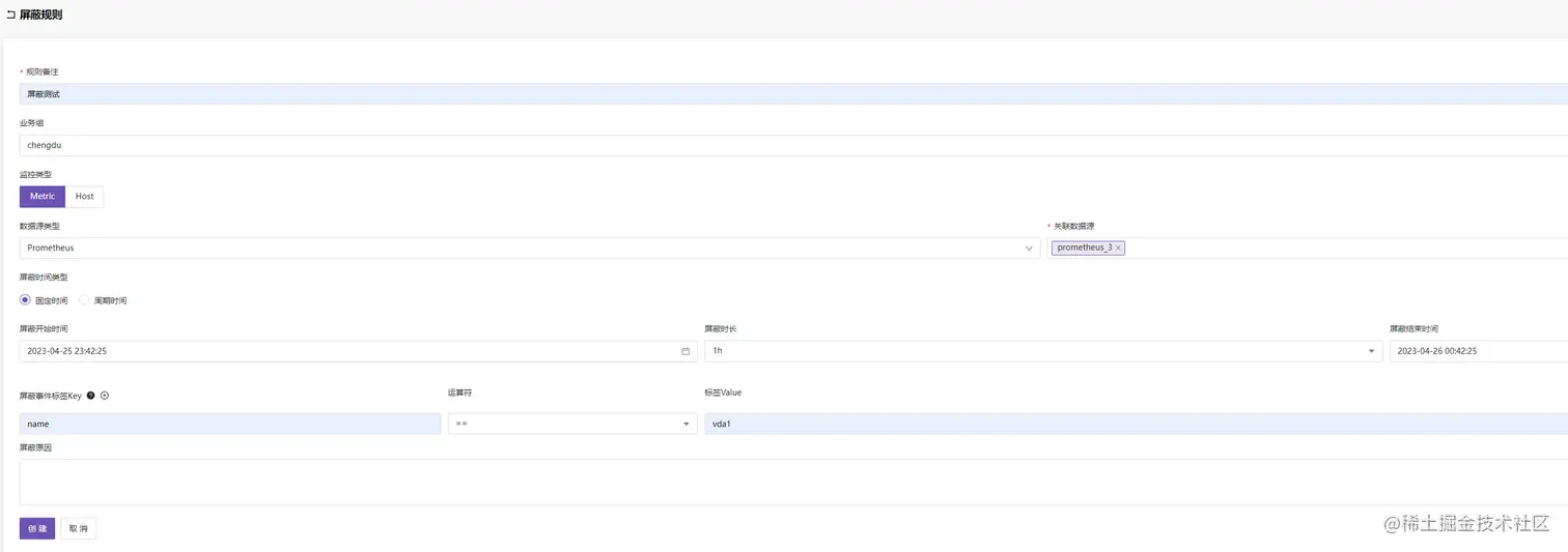 【告警屏蔽】菜单实现告警屏蔽规则或者说告警静默规则,支持固定时间和周期时间,比较灵活,可以根据事件源屏蔽,也可以根据事件标签屏蔽: