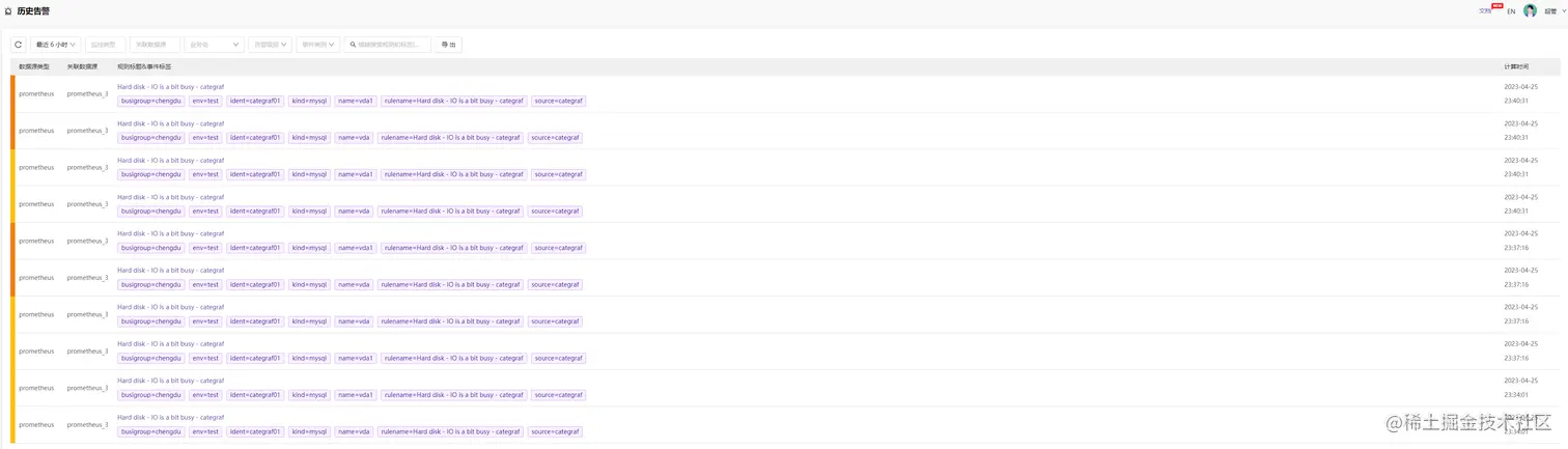 【历史告警】菜单展示全量告警信息,包括所有历史触发过的告警:
