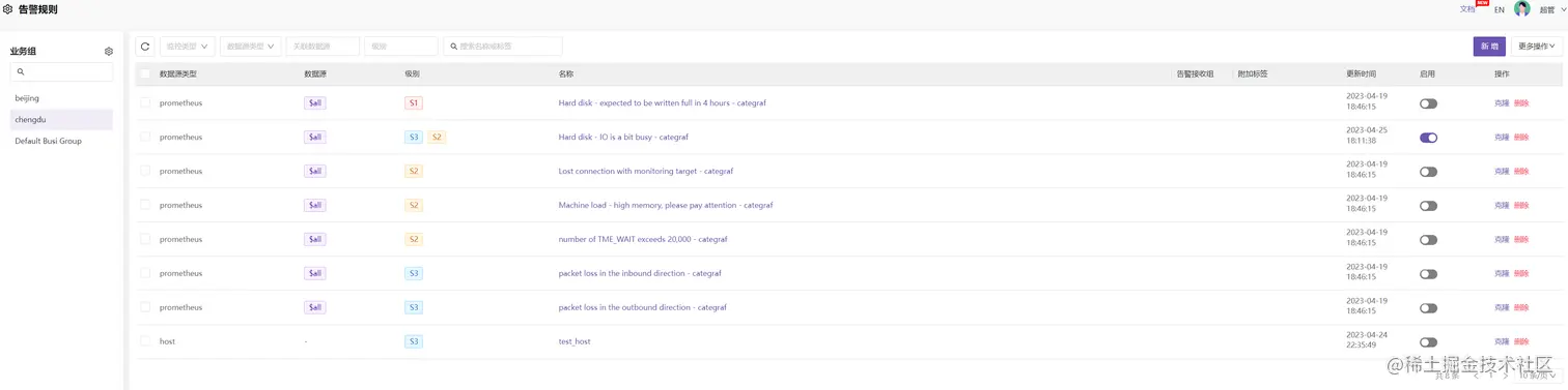 【告警规则】菜单用于管理每个业务组的告警规则,这些告警规则一方面是从【内置规则】克隆方式导入的,另一方面也可以【新增】方式创建: