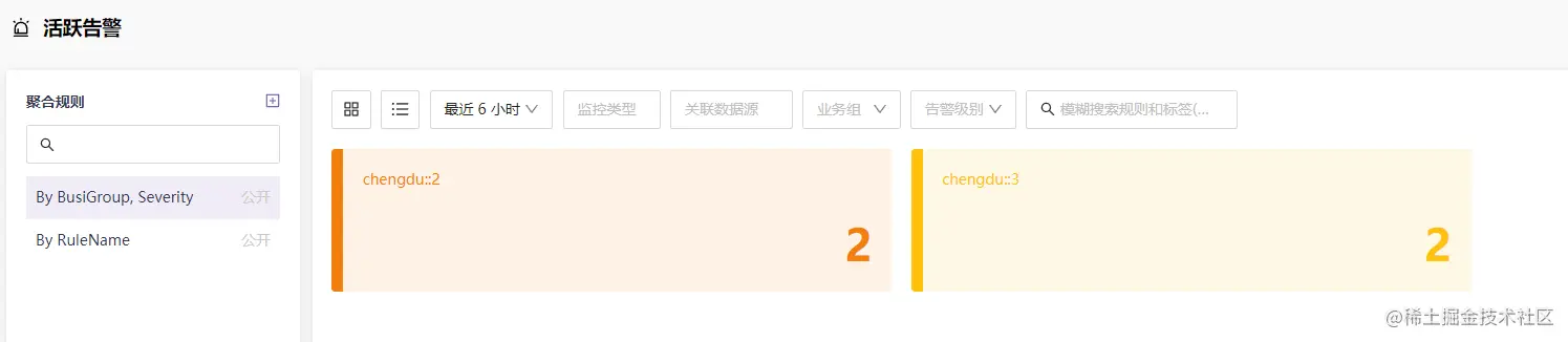 【活跃告警】菜单展示当前触发中的告警,可以从业务组和告警等级维度展示: