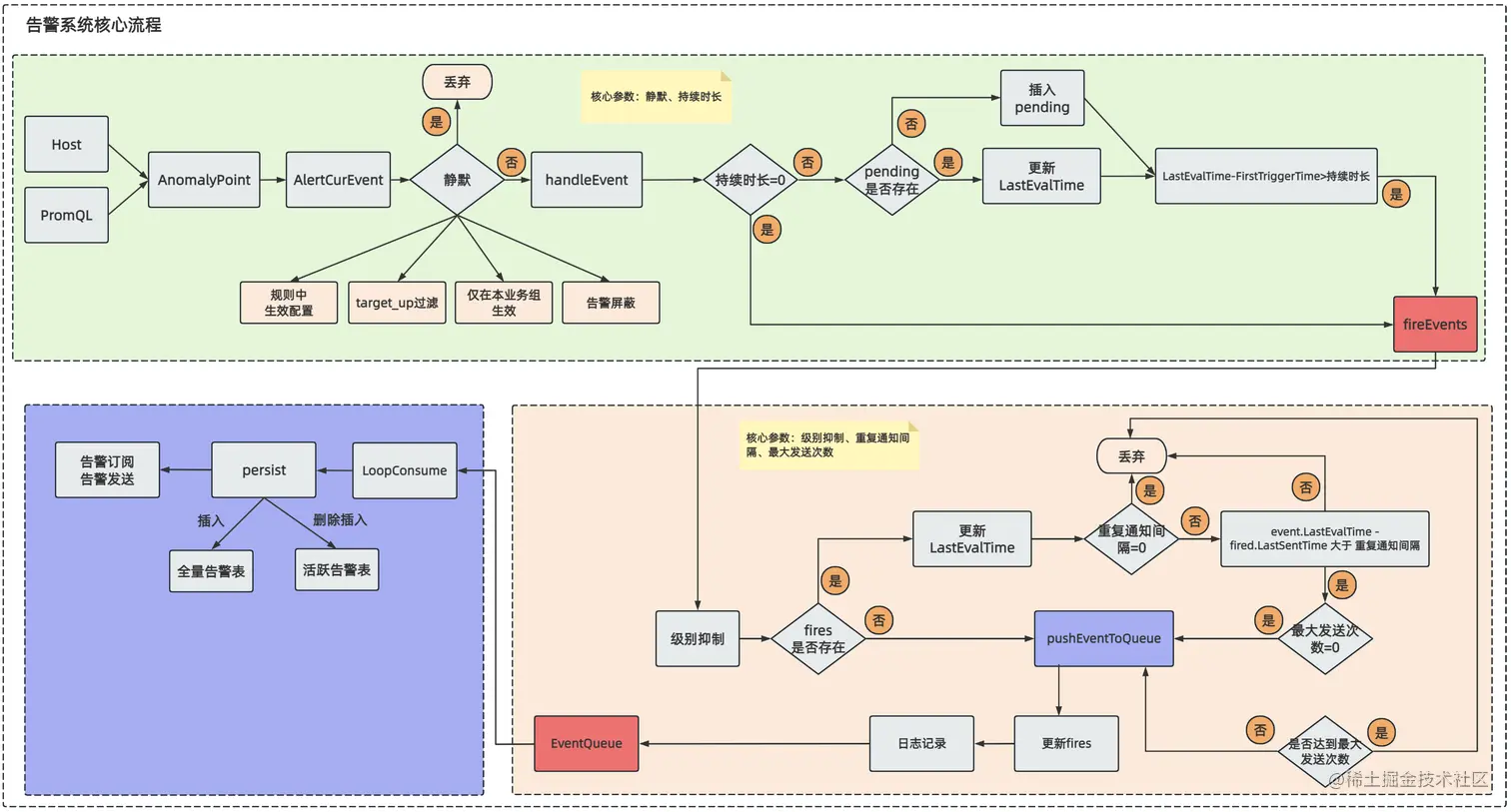 1、对告警系统整个核心流程梳理,可以分为三个主要阶段(「注意图中红色方块重要节点」):第一个阶段完成基于异常点构建告警事件;第二个阶段基于告警事件计算告警是否触发;第三个阶段则是告警触发后置处理,包括持久化、告警发送等处理。