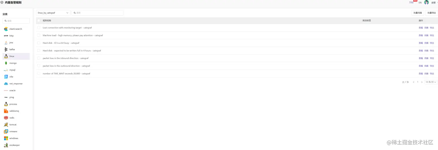 【内置规则】菜单主要提供系统中内置的一些告警规则,按照组件类型进行分类分组:
