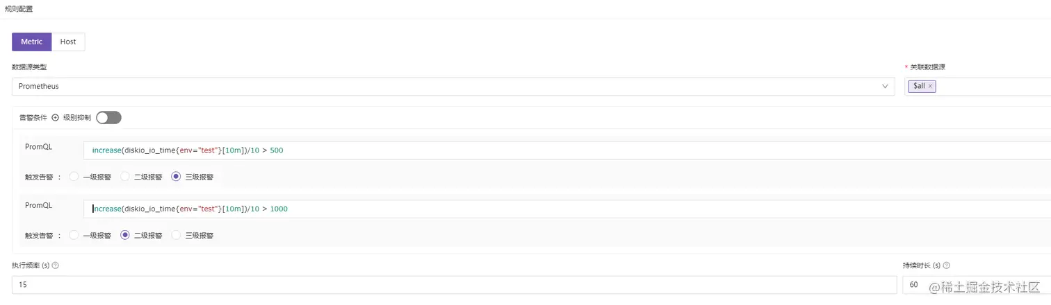 PromQL执行查询数据源。 PromQL:填写告警规则的PromQL语句,这里可以填写多条,主要场景比如"CPU% > 80%"触发三级告警,"CPU% > 90%"触发二级告警,基于不同阈值触发不同告警等级的告警,这里有个【级别抑制】开关,打开级别抑制,则高等级告警抑制低等级告警,比如"当前CPU% > 95%",上面配置的二级告警和三级告警都会触发,但是用户肯定希望收到更高等级的二级告警,就可以打开【级别抑制】开关,避免过多告警干扰。- 执行频率:
