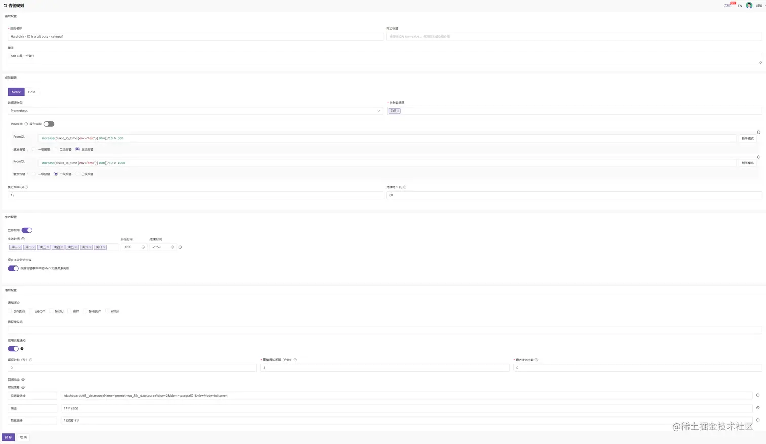 - 系统提供的生效时间还是比较灵活,比如可以细化到星期几的哪个时间区间告警;