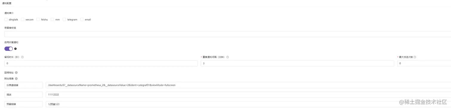 - 重复通知间隔:避免告警风暴,告警触发通知后,后面还在源源不断的触发告警,也必须等到"重复通知间隔"时间后才能再次触发告警通知,如果"重复通知间隔=0"则同一告警事件在一个触发周期内只会发送一次告警。