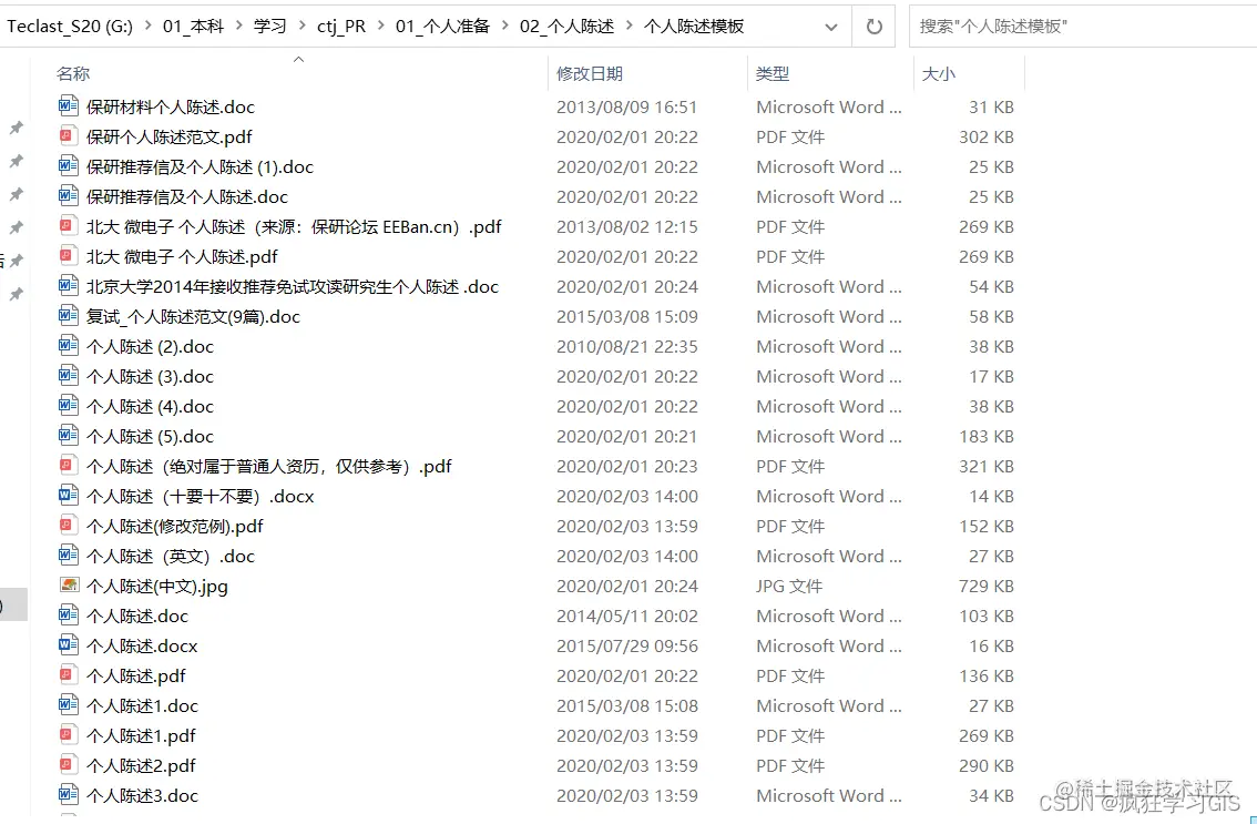 我当初在准备夏令营材料的时候,也是看了无数博客、问答、论坛,收集了无数的个人陈述该怎么写的资料和教程(如下图,收集了无数个文件但其实最后认真看的并没有几个),然后写出了不同字数、不同侧重点的好几个版本的个人陈述。