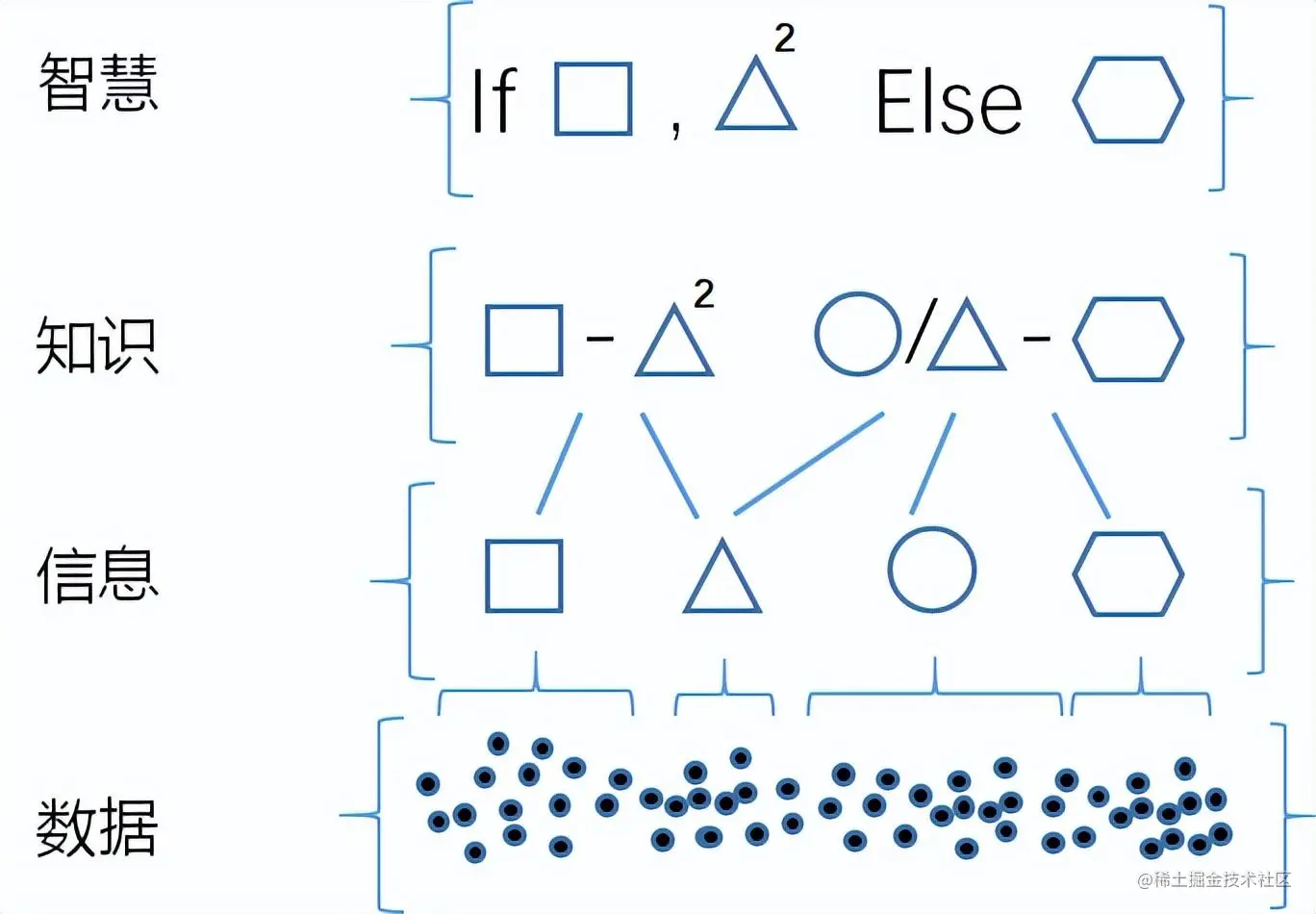 智慧的层次结构图中把杂乱无章的数据描述成了正方形、三角形、圆形和六边形。这里给出信息的更通俗定义:信息用来给数据命名并将数据归入相应的类别。