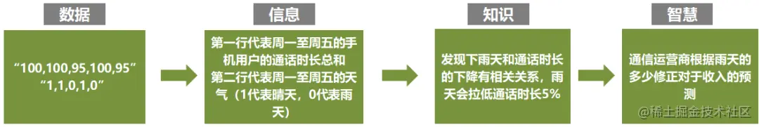 数据、信息、知识和智慧是数据创造价值的四个层次,也许你每天都碰到它们,但并不表示对其有深刻的理解,下面是一个从数据到智慧的例子。