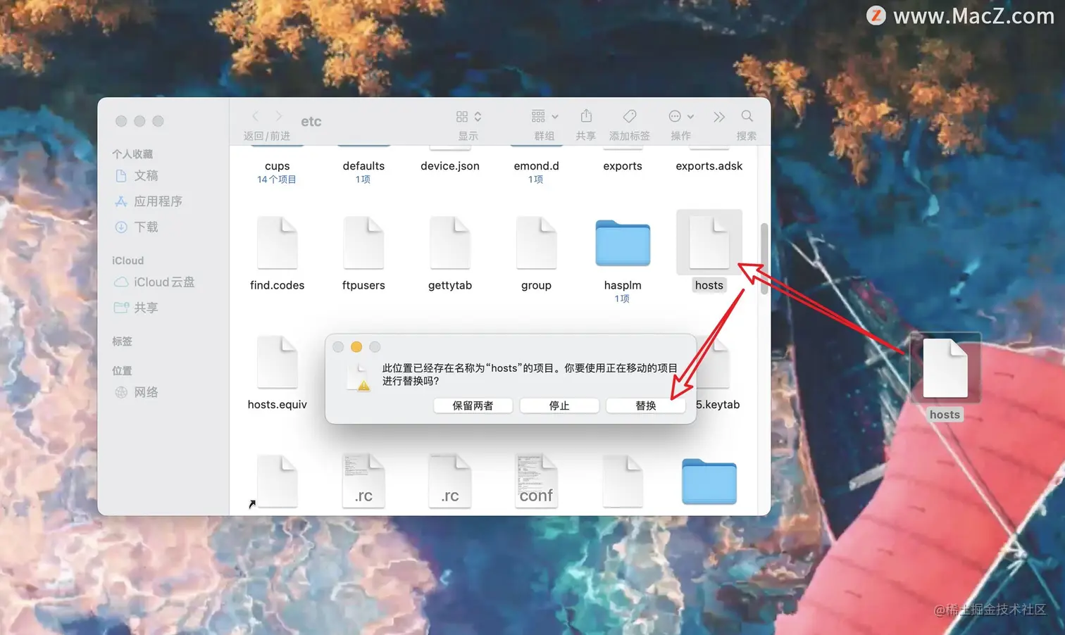 将修改好的hosts文件拖放回etc目录,选择替换