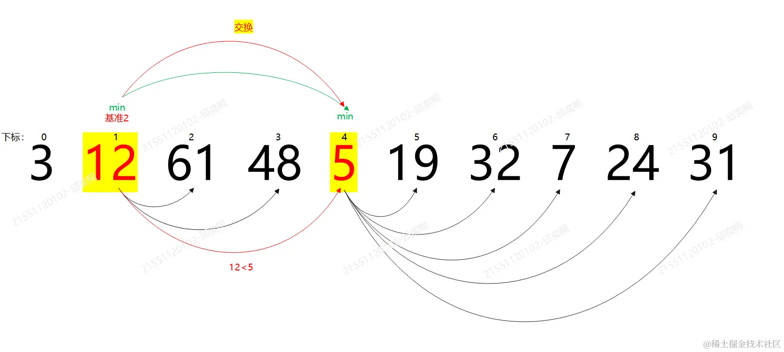 此时基准在下标为1的位置,初始化min=1,对应的元素为12,12分别与后面的元素作比较,当比较到下标为4时,对应的元素为5,12>5,所以min=4,然后5再跟后面的元素作比较,一直比较到最后一个元素,都没有比5小的元素,所以基准所在位置1的对应元素要和min所在位置4的对应元素交换,也就是12和5交换,然后待排数组变成3,5,61,48,12,19,32,7,24,31,第二趟选择排序比较结束。