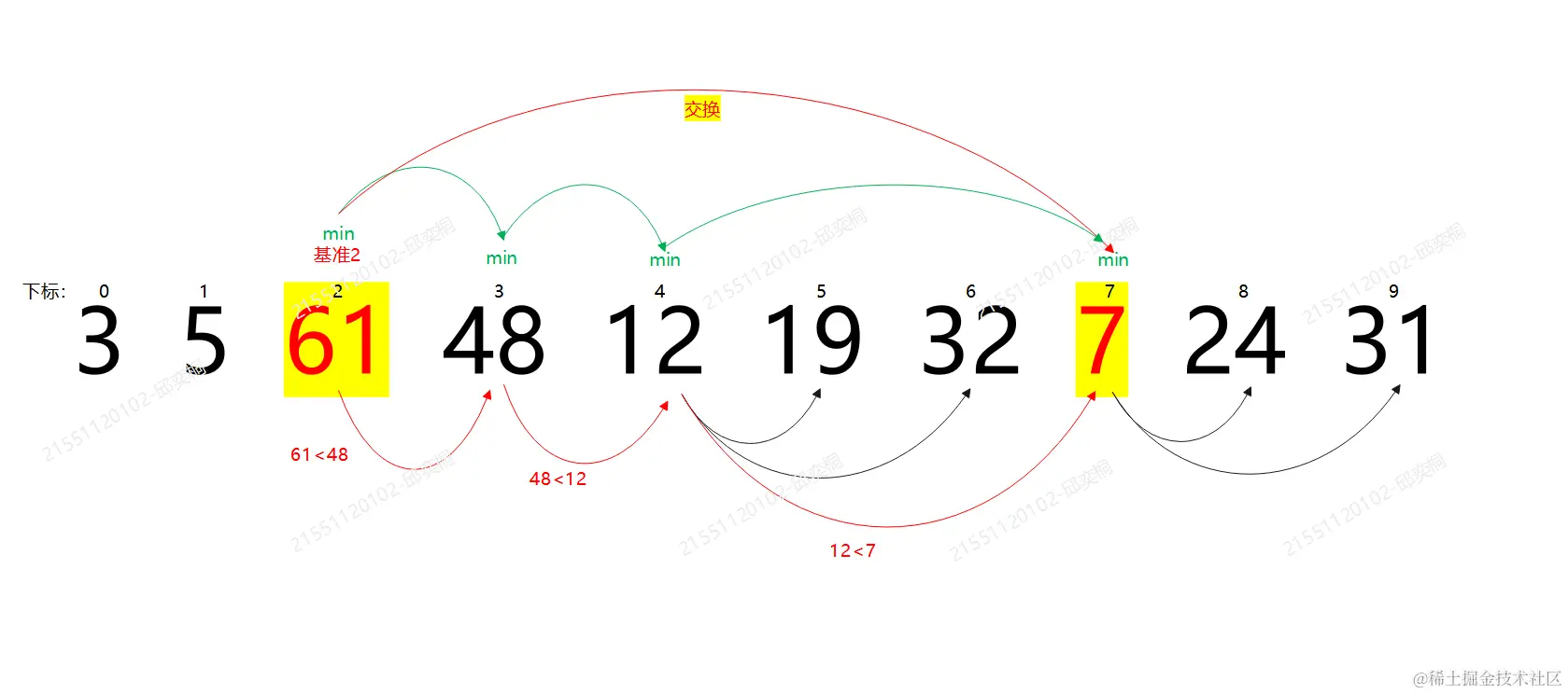 此时基准在下标为2的位置,初始化min=2,对应的元素为61,61分别与后面的元素作比较,当比较到下标为3时,对应的元素为48,61>48,所以min=3。然后48再和后面的元素进行比较,当比较到下标为4时,对应的元素为12,48>12,所以min=4。然后12再跟后面的元素进行比较,当比较到下标为7时,对应的元素为7,12>7,所以min=7。然后7再跟后面的元素进行比较,一直比较到最后一个元素,都没有比7小的元素,所以基准所在位置2的对应元素要和min所在位置7的对应元素交换,也就是61和7交换,然后待排数组变成3,5,7,48,12,19,32,61,24,31,第三趟选择排序比较结束。
