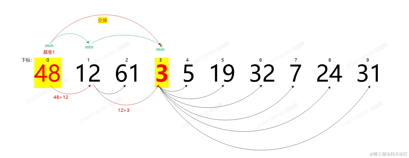 当基准所在位置下标0进行完第一次循环比较后,可以看到此时min在下标为3的位置,所以要将下标为0的元素和下标为3的元素进行交换,也就是48和3交换,此时待排数组变成3,12,61,48,5,19,32,7,24,31,第一趟选择排序比较结束。