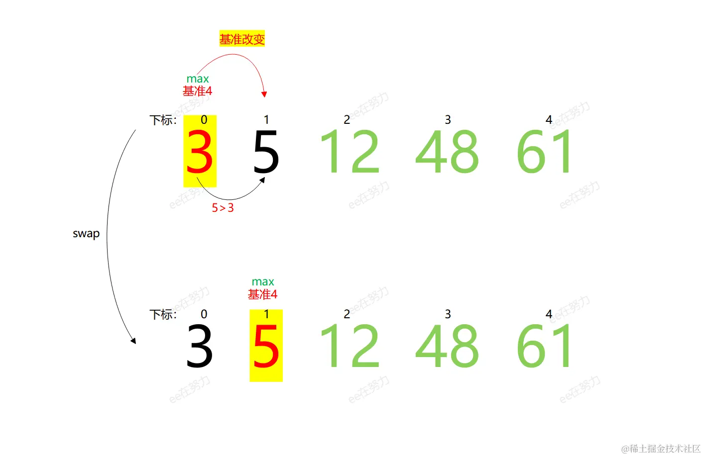 此时基准在下标为0的位置,初始化max=3,3与后面的元素作比较,5>3,此时max=5,不交换位置。此时5已经来到了倒数第4个位置,后面的数已经排序完成,因此5不需要再跟它们比较。此时待排数组变成[3 5 12 48 61],第四趟选择排序比较结束,此时进行了4次比较,也就是N-1次,因此冒泡排序结束,得到排序数组为[3 5 12 48 61]。