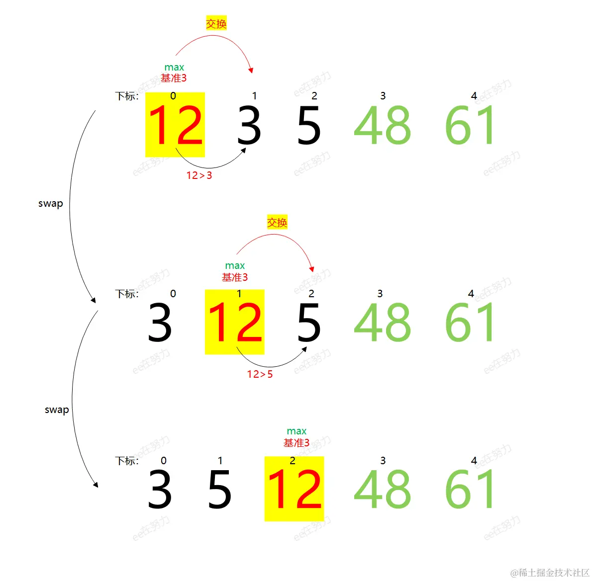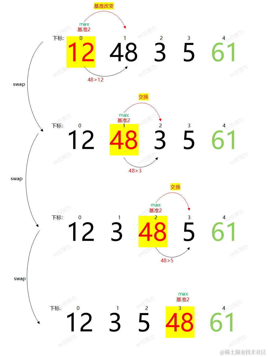 此时基准在下标为0的位置,初始化max=12,12与后面的元素作比较,12>3,所以交换12和3接着max继续与下一个数比较,12>5,交换12和5,此时12已经来到了倒数第3个位置,后面的数已经排序完成,因此12不需要再跟它们比较。此时待排数组变成[3 5 12 48 61],第三趟选择排序比较结束。