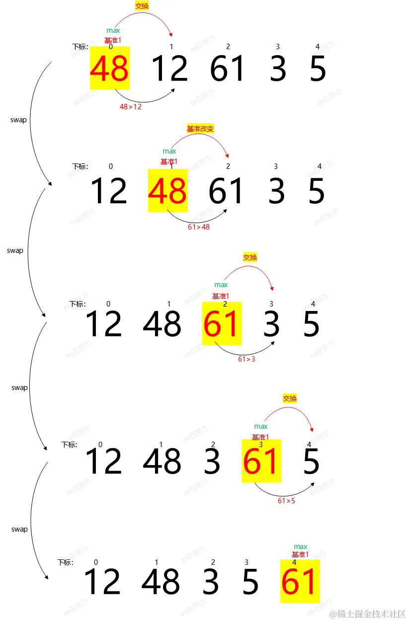 当基准所在位置下标0进行完第一次循环比较后,可以看到此时max在一次次的交换中来到了数组中的最后一个位置,下标为4,也就是N-1(N为待排数组的元素个数)。此时待排数组变成[12 48 3 5 61],第一趟冒泡排序比较结束。
