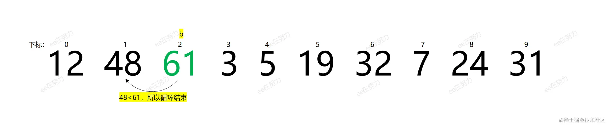 此时待插入元素的下标为i=2,对应的元素为61,令b=61,接着61跟前面的元素进行比较,也就是下标j=i-1=1对应的元素48,因为61>48,所以循环结束,第二趟插入排序比较结束。