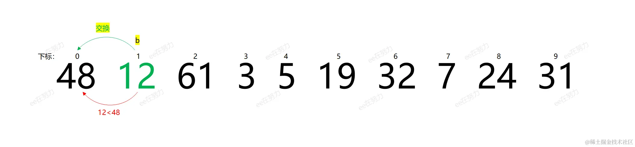 此时待插入元素的下标为i=1,对应的元素为12,令b=12,接着12跟前面的元素进行比较,也就是下标j=i-1=0对应的元素48,因为48>12,所以需要把48向后面挪一个位置,也就是48要移动到j+1=1下标的地方。因为此时j=0,所以循环结束,将b=12插入到j+1=0的位置(因为循环解释的条件为j<=0或b<a[j],然后j--,所以此时j=-1,j+1=0),第一趟插入排序比较结束。此时待排数组为[12,48,61,3,5,19,32,7,24,31]。