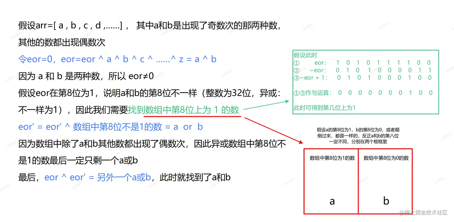 问题:对于一个数组,其中有两种数出现了奇数次,其他所有数都出现了偶数次