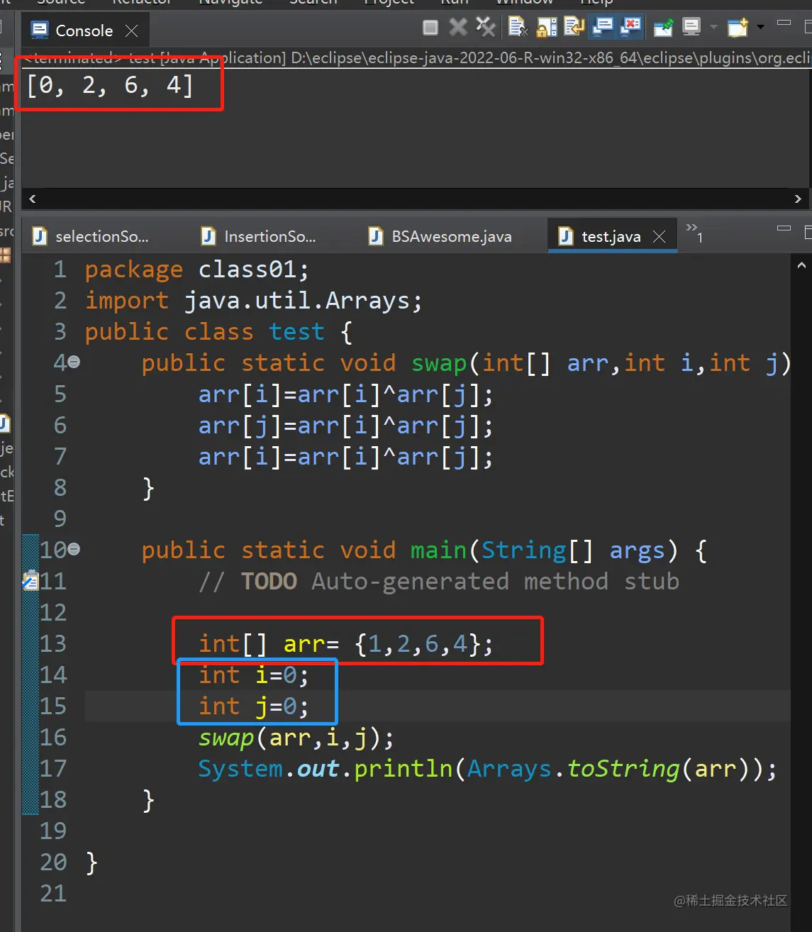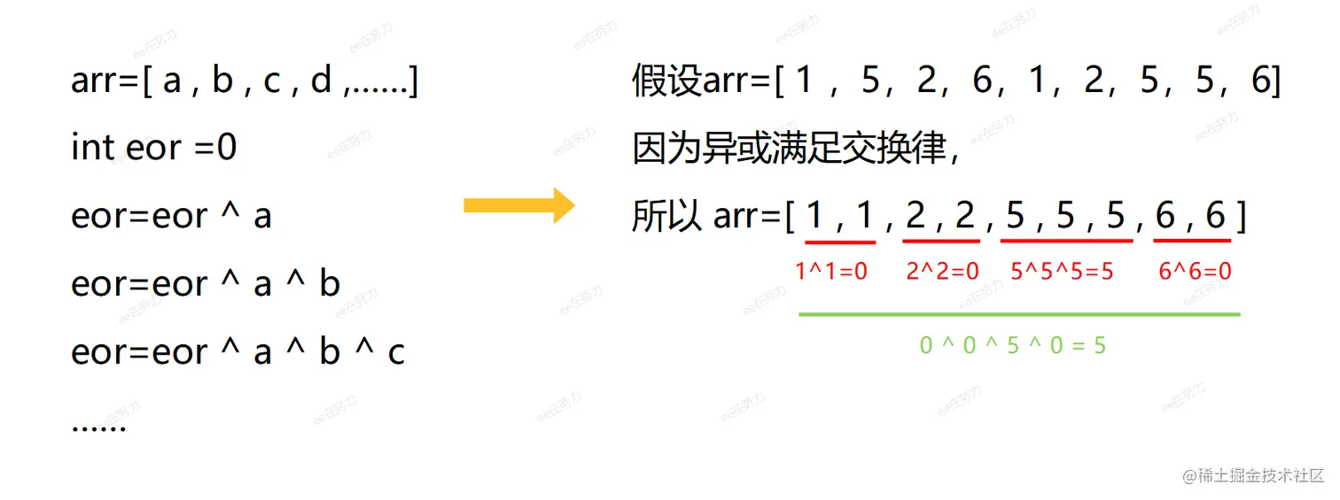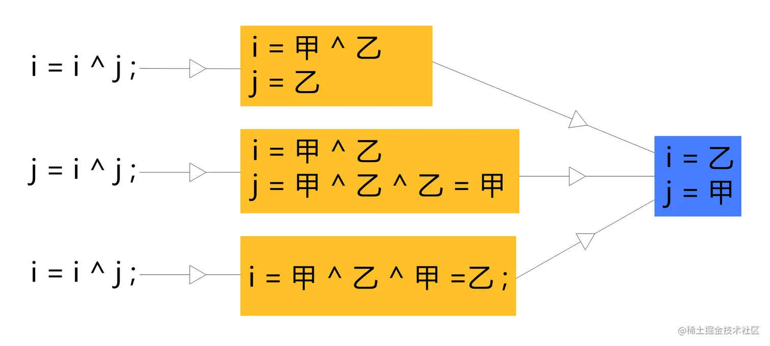 ps:①任何数与0异或都为那个数;② i位置 ≠ j位置,否则会被一起洗成0,如下图。