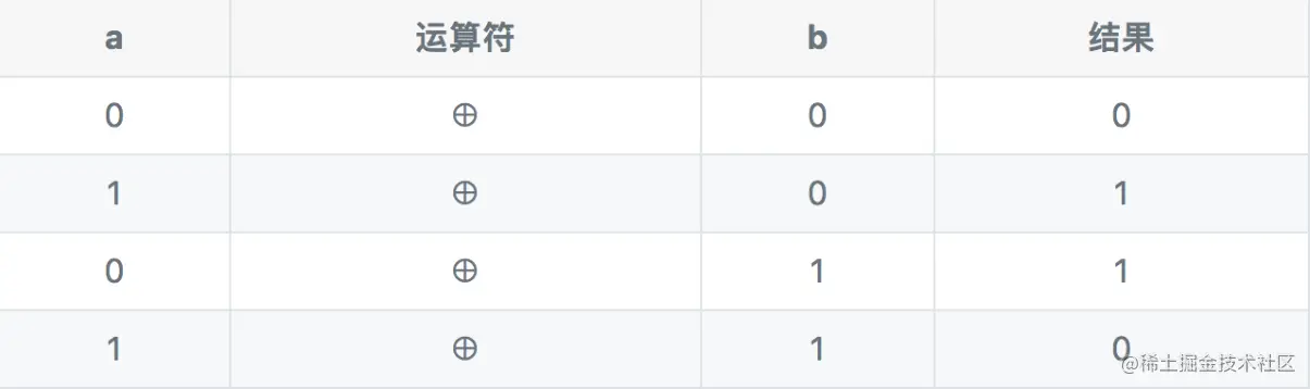 异或是一个数学运算,用于逻辑运算。如果 a、b 两个值不同,则异或结果为 1 ,否则结果为 0 。真值表如下: