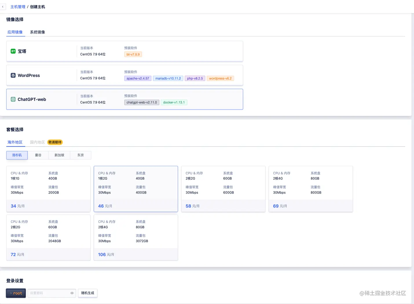 选择ChatGPT-Web应用镜像,地域勾选海外,挑选一个心仪的云服务器套餐