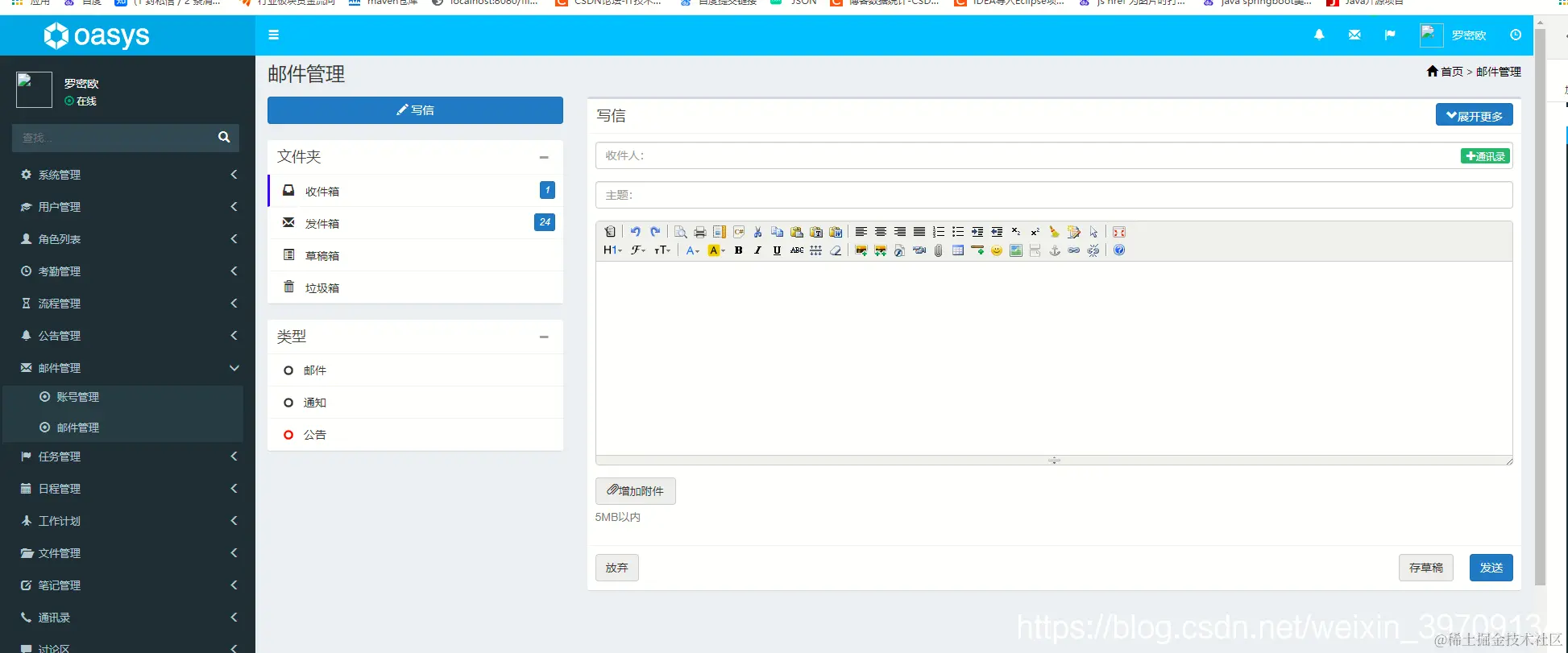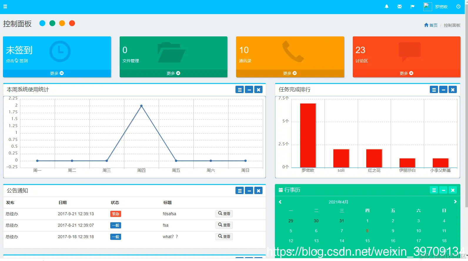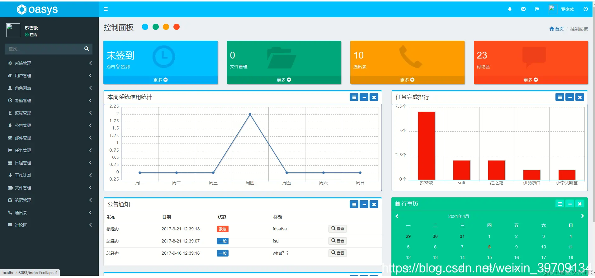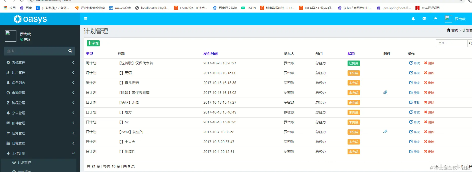 主要功能模块:系统、用户、角色、考勤、流程、公告、邮件、任务、日程、计划、文件、笔记、通讯录、讨论区等多个模块管理 使用Maven进行项目管理,基于springboot框架开发的项目,mysql底层数据库,前端采用freemarker模板引擎,Bootstrap作为前端UI框架,集成了jpa、mybatis等框架。