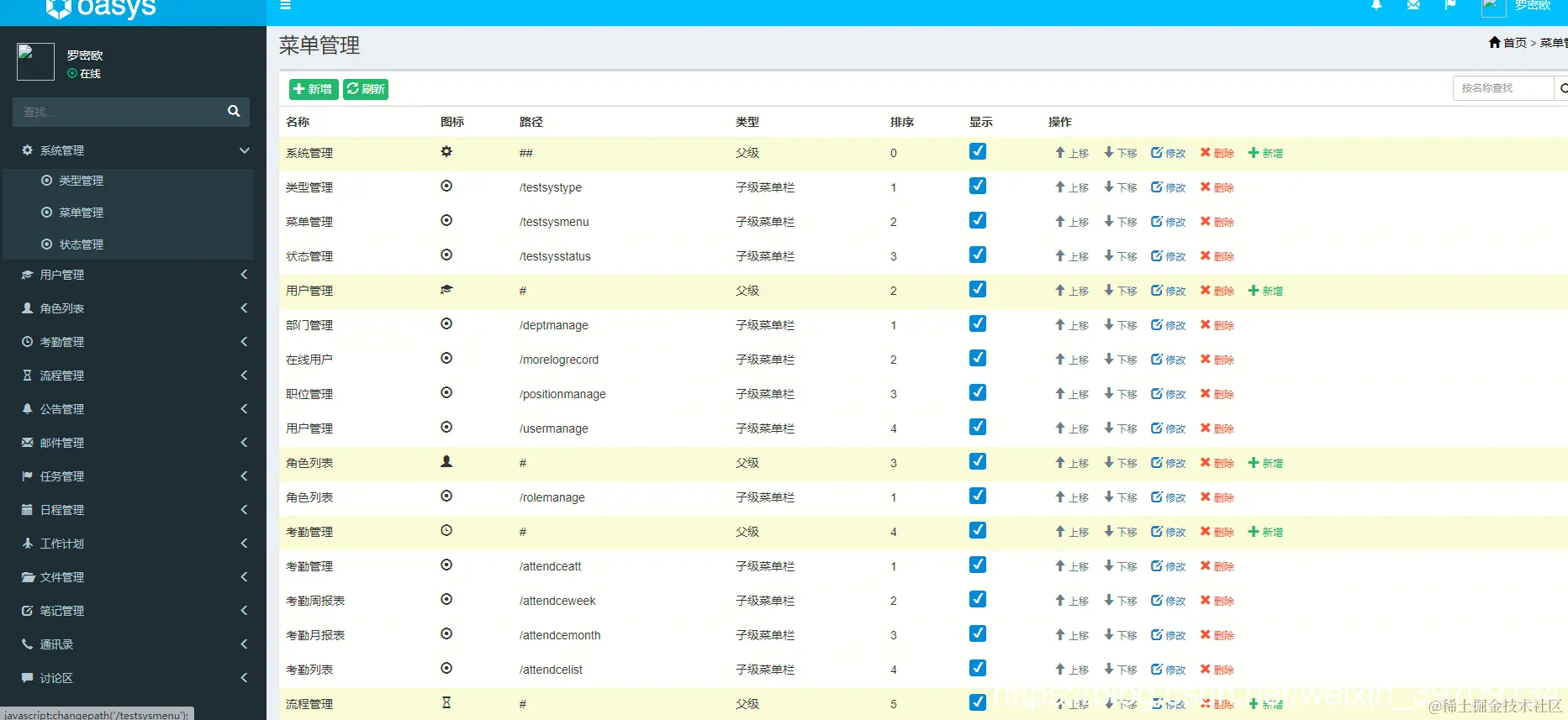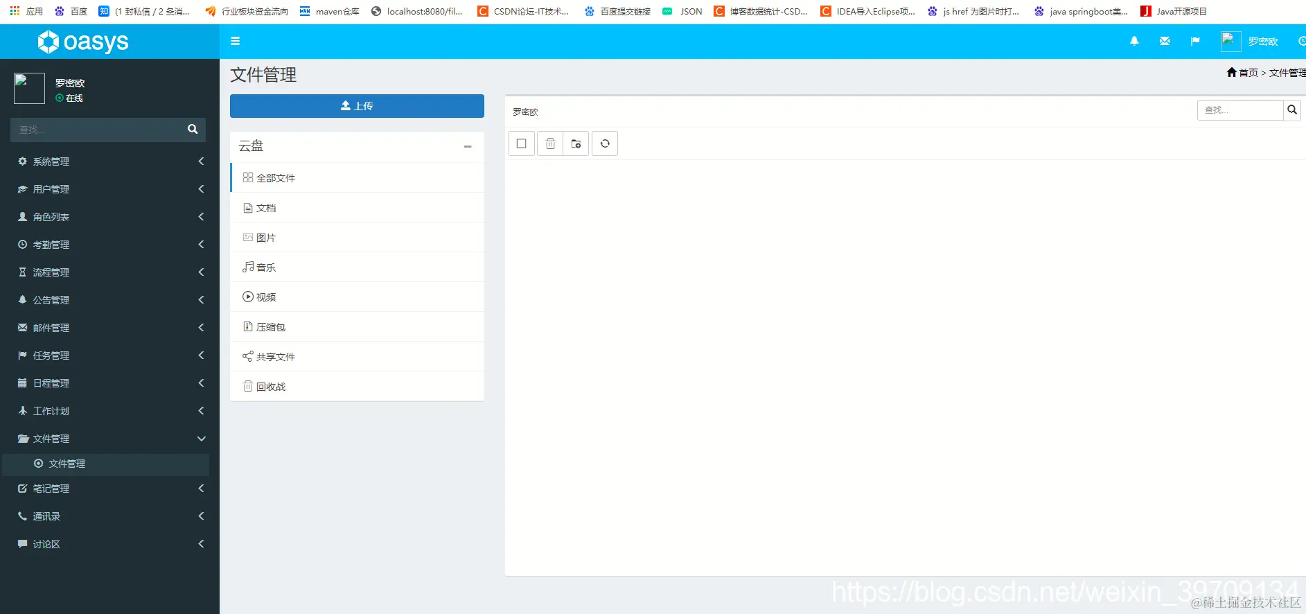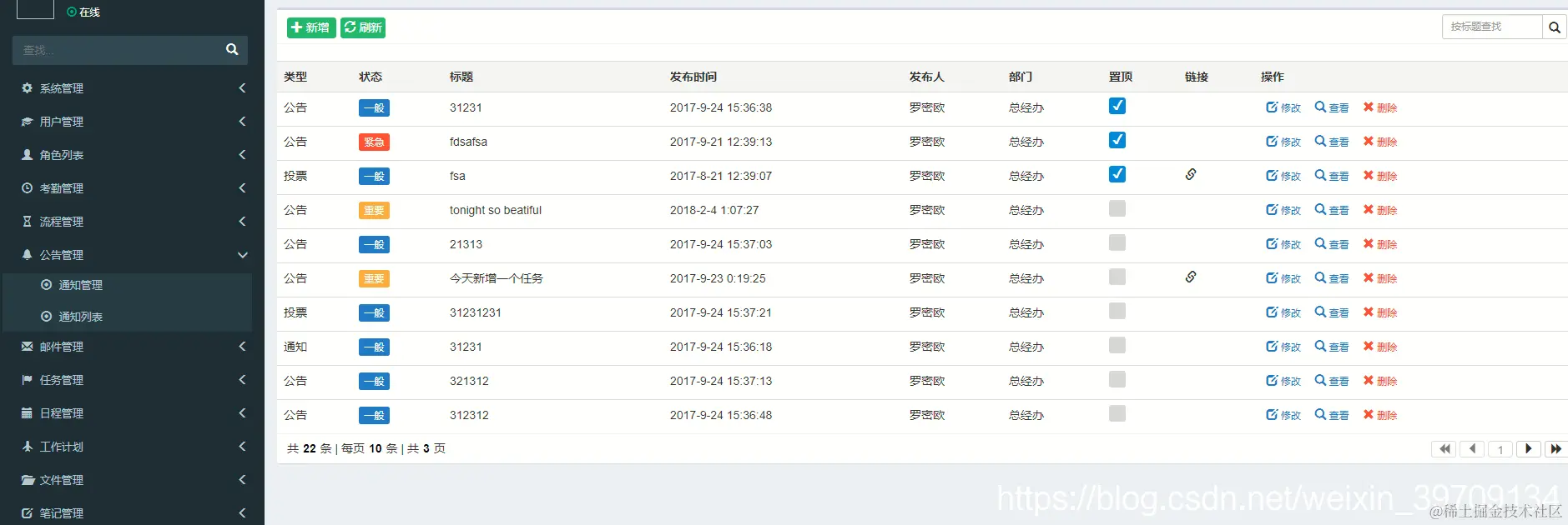 主要功能模块:系统、用户、角色、考勤、流程、公告、邮件、任务、日程、计划、文件、笔记、通讯录、讨论区等多个模块管理 使用Maven进行项目管理,基于springboot框架开发的项目,mysql底层数据库,前端采用freemarker模板引擎,Bootstrap作为前端UI框架,集成了jpa、mybatis等框架。