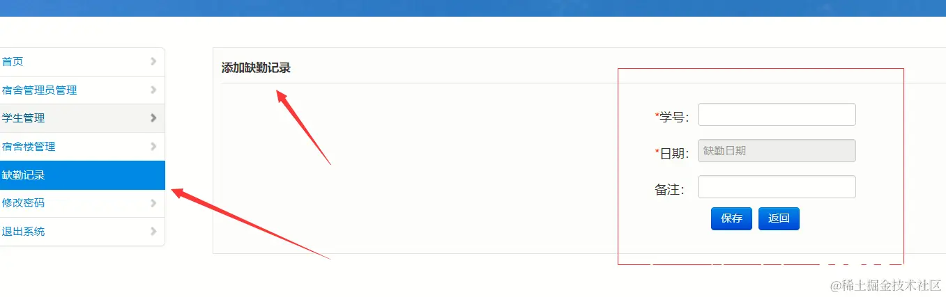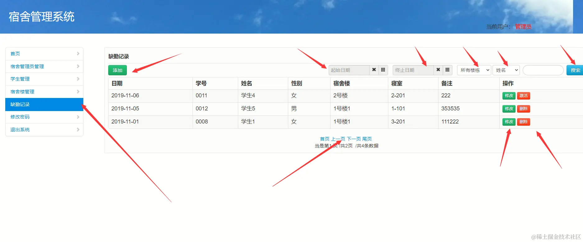 学生缺勤模块:显示学生缺勤列表数据、以及添加学生缺勤和根据、宿舍楼 查询信息 以及修改删除操作