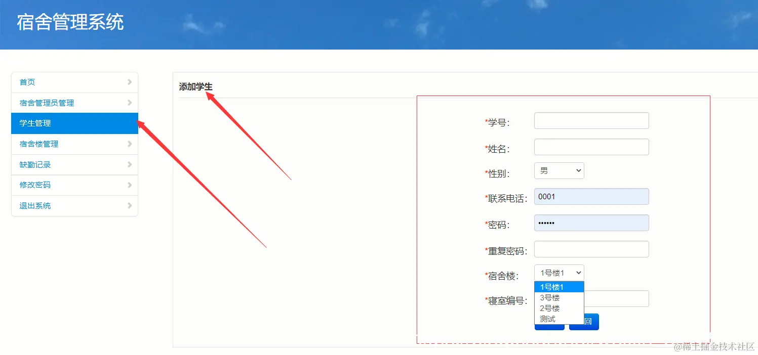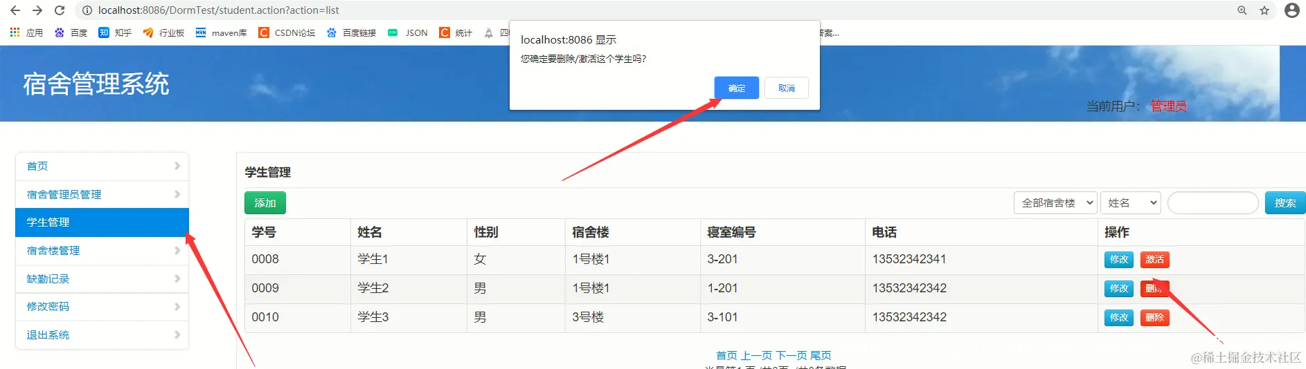 学生管理模块:显示管理员列表数据、以及添加学生信息和根据姓名、宿舍楼 查询信息 以及修改删除操作