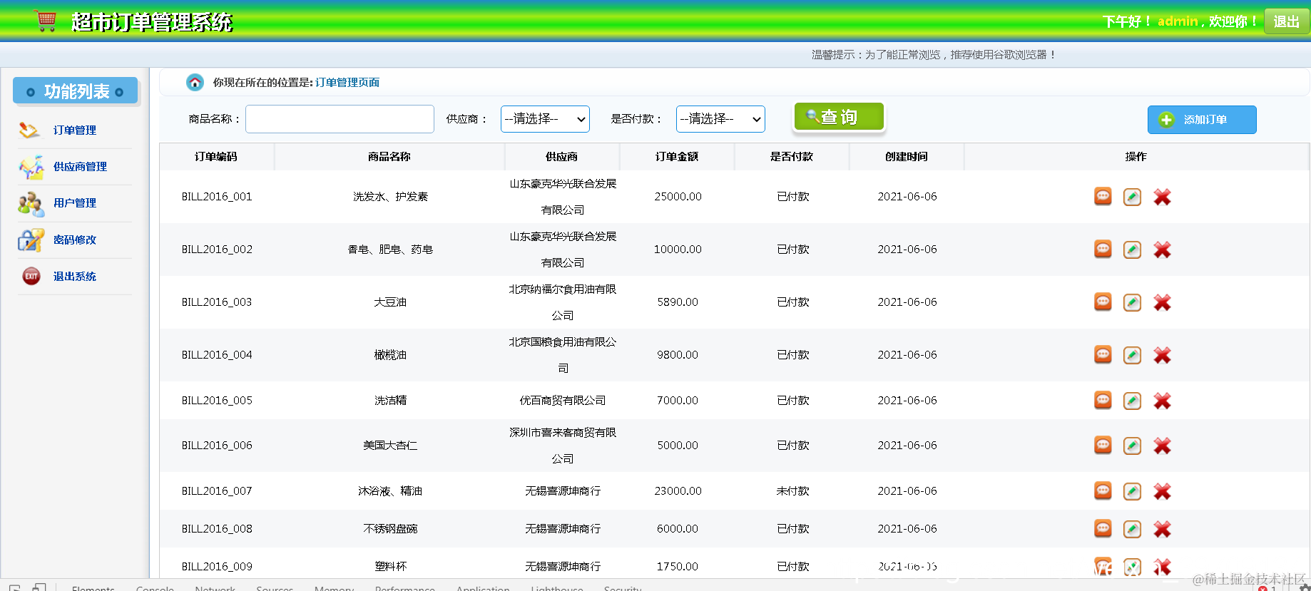 主要功能模块设计为订单管理和供应商管理以及用户管理三个模块